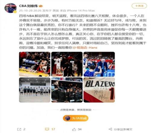 刘维伟这样写道写道:“四场NBA解说结束,明天返程,看完这四场比赛八天相聚,体会很多,一个人在外确实不容易,步步为艰,有时万般无奈,和谁倾诉?无论好与坏,成与败,来到这个舞台就是最优秀的,你不行谁行?未来的路不会顺利,挫折也许有十八弯,也许有八十一难,能改变的只有自身强大,外界的声音是用来敦促你每一天都需要进步,而不是在乎别人怎么想怎么看,真正关心你、在乎你的人都会接受你的一切,永远别忘了是什么让你完成梦想,付出的苦,流过的泪铸就了最高的舞台,向前跑,迎着冷眼和嘲笑,别求任何人满意,只要对得起自己,坚持到底才能看到属于你的闪耀。加油,我们一直陪着你@杨瀚森。”