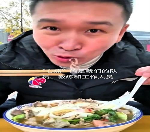 霍楠模仿广东宏远总经理朱芳雨来了一段“副总下班后的快乐”,到四川队主场温江一处潮汕粉用餐。