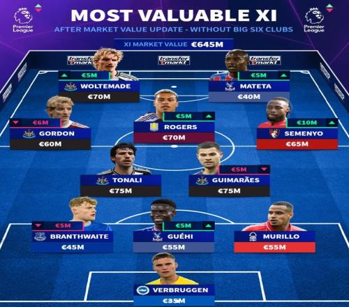 北京时间12月9日,在更新了英超球员的身价之后,德转列出了英超不含BIG6球员的最贵阵容,身价同为7500万欧元的托纳利和吉马良斯领衔,身价7000万欧元的沃尔特马德和摩根-罗杰斯在列